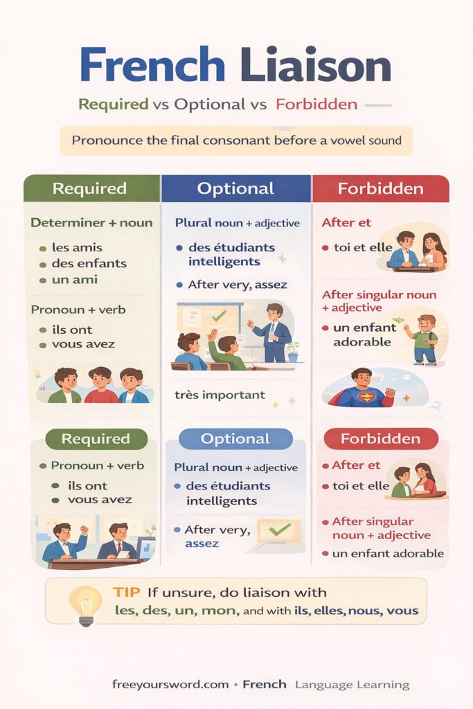 French liaison is one of the fastest ways to sound more natural, but it also causes a lot of confusion. Sometimes it is required, sometimes optional, and sometimes it is flat out wrong. This guide gives you a simple system, real examples, and a quick practice test so you can use liaison with confidence.