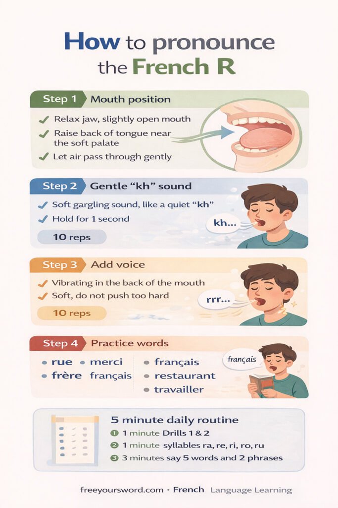 The French R can feel impossible at first, especially if your native language is Spanish or English. The good news is that it is a physical skill, not a talent. You can learn it with the right mouth position and short daily drills. This guide shows you how, with clear steps and practice words.