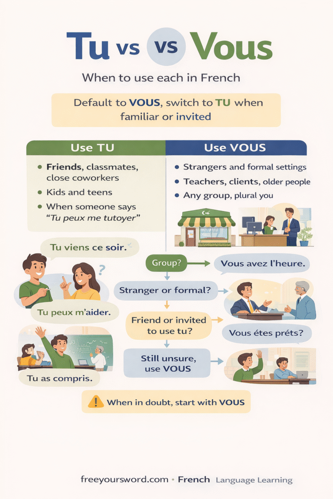 If you are learning French, “tu vs vous” is one of the first things that can make conversations feel stressful. The good news is that native speakers are usually forgiving. Still, choosing the right one helps you sound natural, polite, and confident. This guide gives you simple rules, real examples, common mistakes, and a quick practice quiz.
